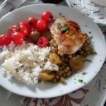 Keywords: arroz, pollo, cerezas, guisantes, receta fácil, comida familiar, saludable