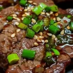 Deliciosos bifes de res marinados en salsa de soja y miel, acompañados de cebollas verdes frescas.