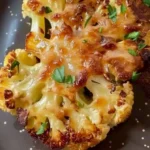 Deliciosas bistecas de coliflor cubiertas con una mezcla de especias y queso, perfectas como alternativa ligera a la carne.