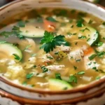 Un reconfortante caldo de pollo con arroz de coliflor, perfecto para una comida rápida y saludable.