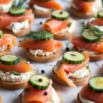 Deliciosos canapés de salmón ahumado con queso crema y alcaparras, perfectos para cualquier ocasión.