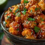 Una deliciosa receta vegetariana de coliflor con una salsa pegajosa de sésamo, perfecta para compartir o disfrutar en casa.