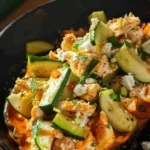Disfruta de estas mitades de calabacín rellenas de pollo Buffalo, mezcladas con crema ácida y queso crema para un plato delicioso y ligero.
