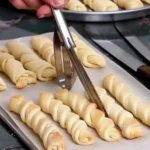 - Enrolla las tiras de masa y colócalas en una bandeja para hornear forrada con papel pergamino.