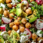 Una vibrante ensalada de garbanzos, feta y aguacate, perfecta para un almuerzo ligero o una cena nutritiva.