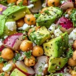 Una ensalada fresca y nutritiva que combina garbanzos, aguacate y queso feta, perfecta para un almuerzo ligero o guarnición.