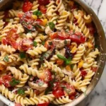 Sirve la ensalada de pasta en platos individuales o en una fuente grande. Puedes decorar con hojas de albahaca fresca o con unos trozos de queso feta adicionales por encima. Esta ensalada se puede acompañar de un buen pan crujiente o con una bebida refrescante.