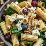 - Mezclar la ensalada: En un tazón grande, combina la pasta enfriada, las espinacas, el queso feta, los arándanos y las nueces. Añade el aderezo y mezcla bien antes de servir.