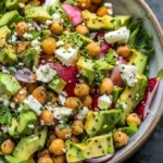Una ensalada deliciosa y saludable que combina garbanzos, feta y aguacate con hierbas frescas, ideal para un almuerzo ligero o como acompañamiento.