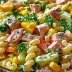 - En un tazón grande, combina la pasta fría, jamón (si lo usas), zanahoria, maíz, pimiento, cebolla y pepino. Vierte el aderezo y mezcla suavemente.