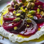 - Extiende la feta batida en un plato y coloca las remolachas marinadas encima. Espolvorea los pistachos y el aneth fresco, y rocía con aceite de oliva y pimienta negra al gusto.