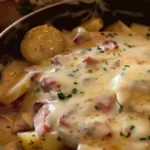 Un plato reconfortante y cremoso con capas de textura: papas suaves, jamón y tocino crujientes, y queso derretido.