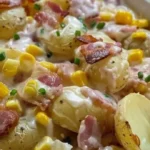 Una deliciosa receta de patatas cremosas con bacon crujiente y maíz dulce, perfecta para una cena rápida y reconfortante.
