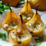 Deliciosas peras asadas con una mezcla dulce y salada de gorgonzola y miel, ideales como aperitivo o postre.
