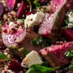 Una deliciosa pierna de cordero sobre una colorida ensalada de quinoa y remolachas, coronada con feta batida.