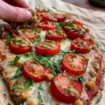 Deliciosa y saludable pizza hecha de quinoa y garbanzos, ideal para veganos y vegetarianos.