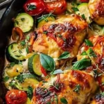 Un delicioso plato mediterráneo de pollo y calabacín al horno, fácil de preparar y lleno de sabor.