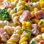 - En un tazón grande, combina la pasta, el jamón (si lo usas), zanahorias, maíz, pimiento, cebolla y pepino. Agrega el aderezo y mezcla suavemente.