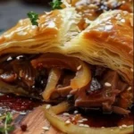 Deliciosos rollos de hojaldre rellenos de pato desmenuzado, cebollas caramelizadas y queso brie, perfectos para impresionar a tus invitados.