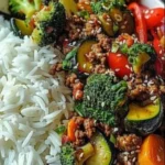 Tazón de Salteado Picante de Carne Picada con Verduras al Ajo y Arroz Vaporoso